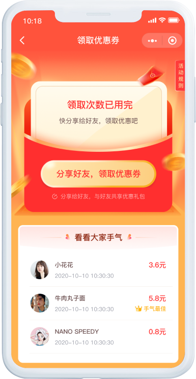 可设置用户分享优惠券后,第N个领取人获得最大金额N元的方式提高裂变效果,或以领取随机金额优惠券的方式提升活动趣味性。